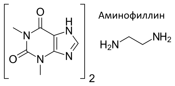 Активным веществом препарата является аминофиллин, считающийся синтетической производной теофиллина (растительного алкалоида) и этилендиамина. Последний придает теофиллину способность растворяться, позволяет создавать на его основе лекарственные формы и повышает его абсорбцию.