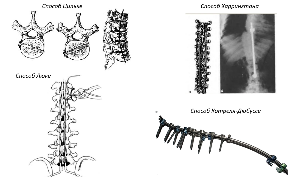 При этом применяют несколько подходов к устранению искривления. В первую очередь убирается зажим с помощью расширения пространства между позвонками за счет вживления имплантата. Проблемная область иммобилизируется. Для этих целей применяют крючки или специальные винты.