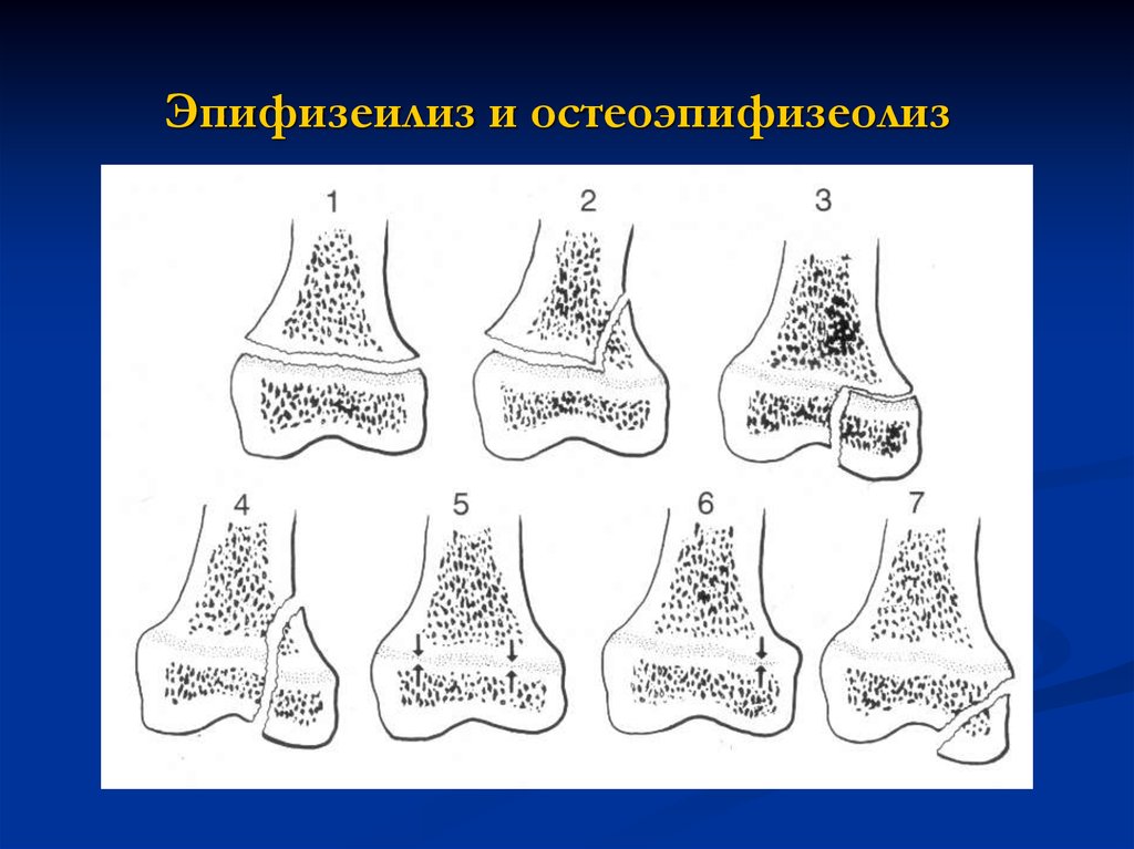 При эпифизеолизах и остеоэпифизеолизах наблюдается повреждение эпифиза — суставной поверхности, формирующей сустав вместе со смежной костью.
