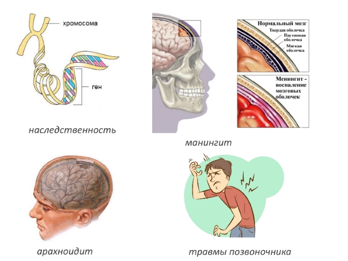 Остальные пациенты, страдающие сирингомиелией, имеют приобретенную форму болезни. Спровоцировать синдром сирингомиелии могут инфекционные воспаления спинного и головного мозга (менингит, арахноидит и пр.). Считается, что в некоторых случаях поводом могут стать и слишком сильные физические нагрузки. Частые причины для образования полостей в спинном мозге — это травмы позвоночника.