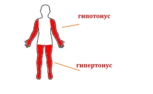 Наблюдаются проявления мышечной дистонии или сочетания гипертонуса и гипотонуса мускулатуры. В этом случае характерно одновременное напряжение, например мускулатуры ног, и ослабление мышц в руках. Причиной чаще становится родовая травма. В большинстве случаев устраняется с помощью консервативных методик лечения и курса массажа.